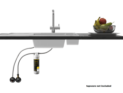 High Flow Underbench Filtration System - HF1M Suitable for an application where there is an existing kitchen tap. There is no need to drill holes in benches or sinks, nor is there a need to install a separate filter tap. Filters all cold water flowing through the existing tap.